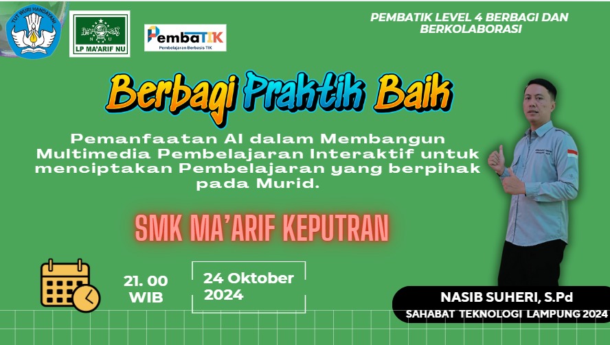 Rangkaian kegiatan Berbagi Praktik Baik oleh Sahabat Teknologi Lampung 2024, Nasib Suheri,S.Pd, terus bergulir. Kali ini dilaksanakan secara daring pada para guru SMK Maarif Keputran, pada Kamis 24 Oktober 2024, mulai pukul 09.00 WIB sampai dengan selesai. Tema yang diangkat pada kegiatan tersebut adalah “Pemanfaatan AI dalam Membangun Multimedia Pembelajaran Interaktif yang Berpihak Pada Murid”.